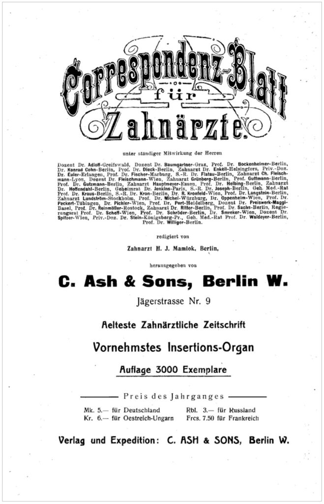 Konrad also published significant amount of articles (60+) for various Dental & Medical magazines like “Deutsche Zahnärztliches Wochenblatt”, “Correspondenz-blatt für Zahnärzte” and “Deutsche Monatsschrift für Zahnheilkunde” but also international magazines like “The Dental Review” or “Dental Cosmos”. A list of publications from the hands of Konrad can be found below.