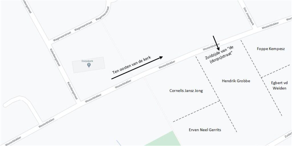 Hendrik Grobbe een “Boerenhuijs…staande en gelegen aan de zuijdzijde van de weg beoostende kerk van Westerblokker, belent Foppe Kempesz ten oosten, Cornelis Jansz Jong ten westen, mitsgaders een stuk grasland daar agter…belent Egbert van der Weiden ten oosten, de erven van Neel Gerrits ten westen..”