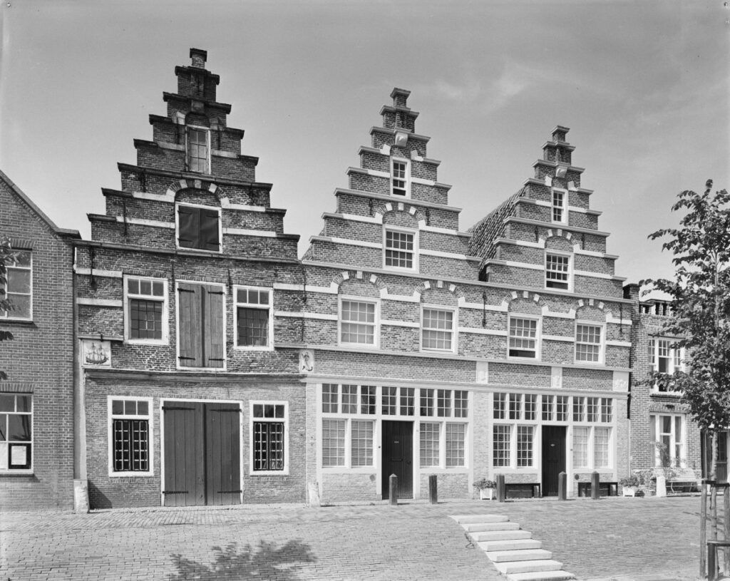 De huizen zijn gebouwd in renaissance-stijl, met fraaie 17de-eeuwse trapgevels. De bakstenen gevels worden geleed door natuurstenen banden en waterlijsten. Een fries loopt door over de drie gevels en is voorzien van vijf gevelstenen. Uiterst links en uiterst rechts bevinden zich twee zeilschepen. De drie gevelstenen daartussenin beelden ‘hoop’ of ‘wijsheid’, ‘geloof’ en ‘matigheid’ uit.
