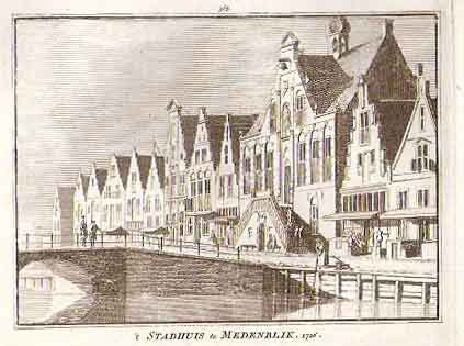 Wel durf ik met enige zekerheid vast te stellen dat Pieter Jansz Goedhart het huis bewoonde dat ten westen (links) van het oude raadhuis in Medemblik stond. Hoe dan? Een transportakte waarin ene Pieter Goedhart (helaas wederom zonder patroniem) op 22 april 1789 een huis verkoopt staat: “Een huijs, erf en grondt staande en gelegen aan de westzijde van het raadhuijse binnen dese stad, belendt met theunis pijl ten westen, en met het raadhuijse ten oosten.”