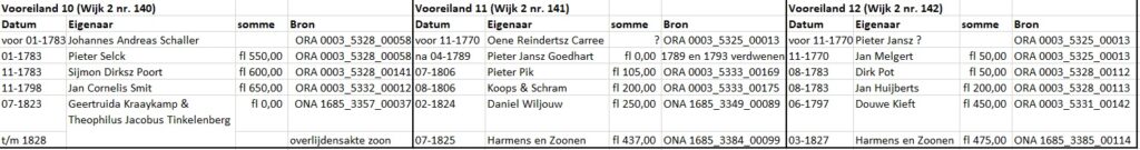 Door een overzicht te maken van de verkopen van de betreffende panden vanuit transportaktes krijg je een goed overzicht wie op welk moment eigenaar was van een pand. Als we kijken naar de transportaktes van Vooreiland 12, dan zien we daar belendingen in terugkomen waarmee we de precieze locatie kunnen duidden, vanwege een markant pand genaamd “Pakhuis De Wolf”.