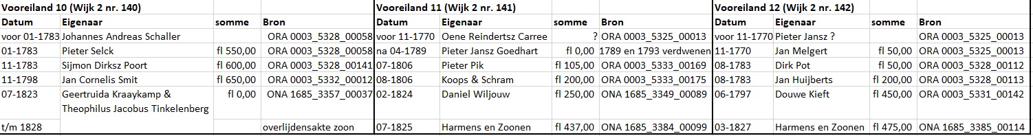 Bij het doorpluizen van de transportaktes van dit huis (en de aangrenzende huizen) en het in kaart brengen van de belendingen kom ik tot de conclusie dat op 11 november 1770 bij verkoop van Vooreiland 12, Vooreiland 11 in bezit is van Oene Reindertsz Carré. Dat is de vader van Pieter zijn vrouw Jacoba Carré en hij overleed in april 1789. Kortom het is zeer aannemelijk dat Pieter het huis samen met zijn vrouw heeft geërfd van Oene Carré. Ook vanuit de verpondingkohieren is duidelijk dat Oene tussen 1780 en 1789 geen kohieren (belasting) hoefde te betalen. Dat is bijzonder…